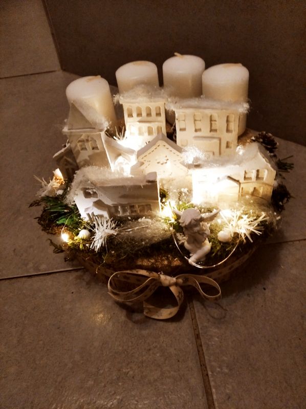 Adventní svícen se 4svíčkami, lepený na dřevěném podkladu, zdobený přírodním mechem, se čtyřmi svíčkami, s vesnickou z kamenné sádry,s posněženými šiškami,s LED světélky