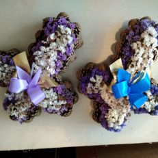 Křížek z borových nebo modřínových šišek, vyplněný staticí, lakovaný, zdobený mašličkou. Různé barvy dle aktuální nabídky.