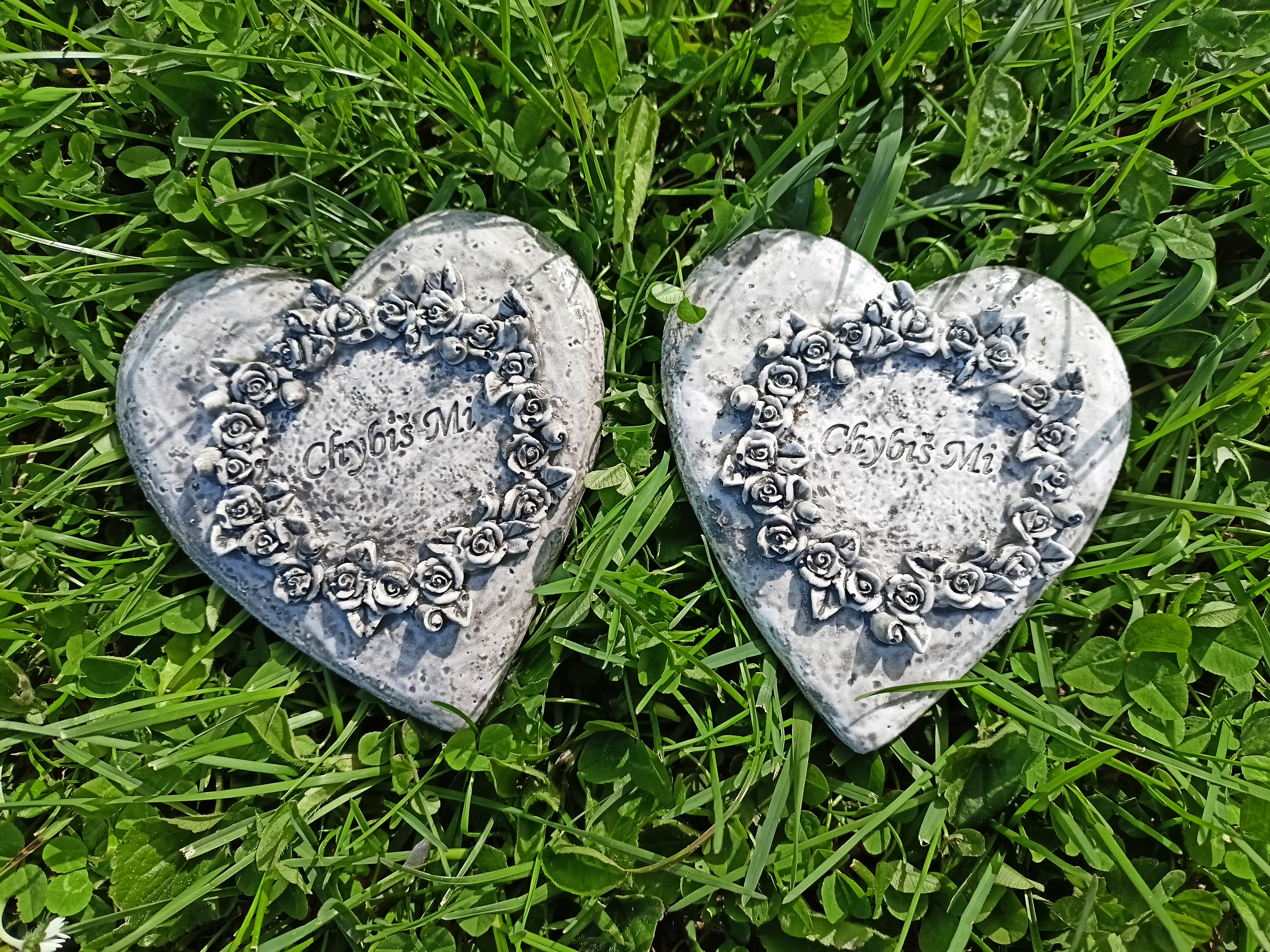 Srdce s nápisem Chybíš mi a kruhem z růží odlité z lite keramiky Efcostone s dlouhou životností, barvené akrylovými barvami, lakované, vhodné ven, např na hřbitov