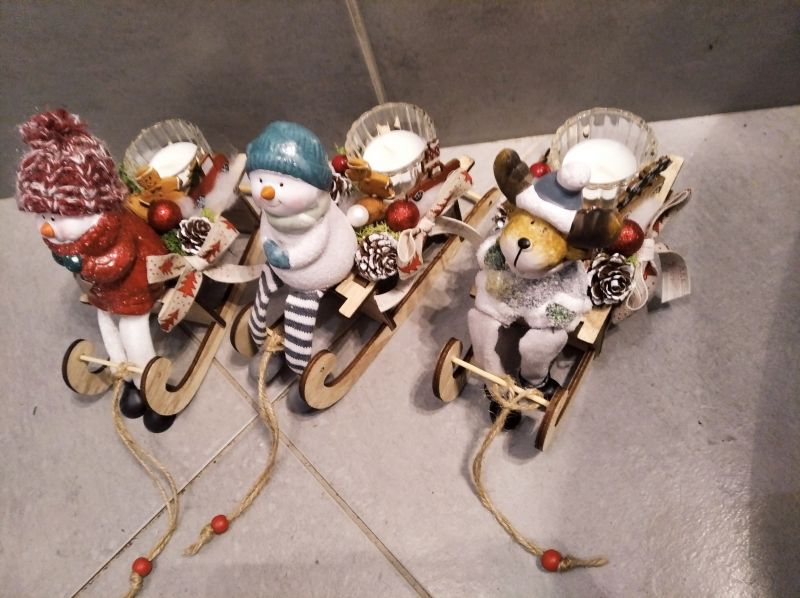 Svícen s keramickou figurkou na dřevěných sáňkách. Se svícínkem na čajovou svíčku, včetně svíčky.