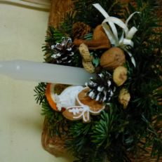 Svícen aranžovaný do květináčku. Zdobený přírodními ozdobami,perníčky a šištičkami. Pozor - dekorace, zapalovat pouze pod dohledem.