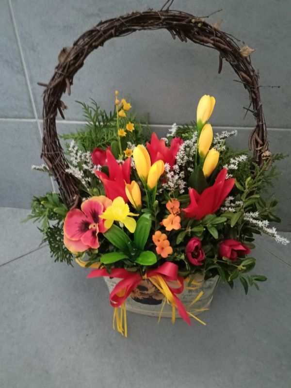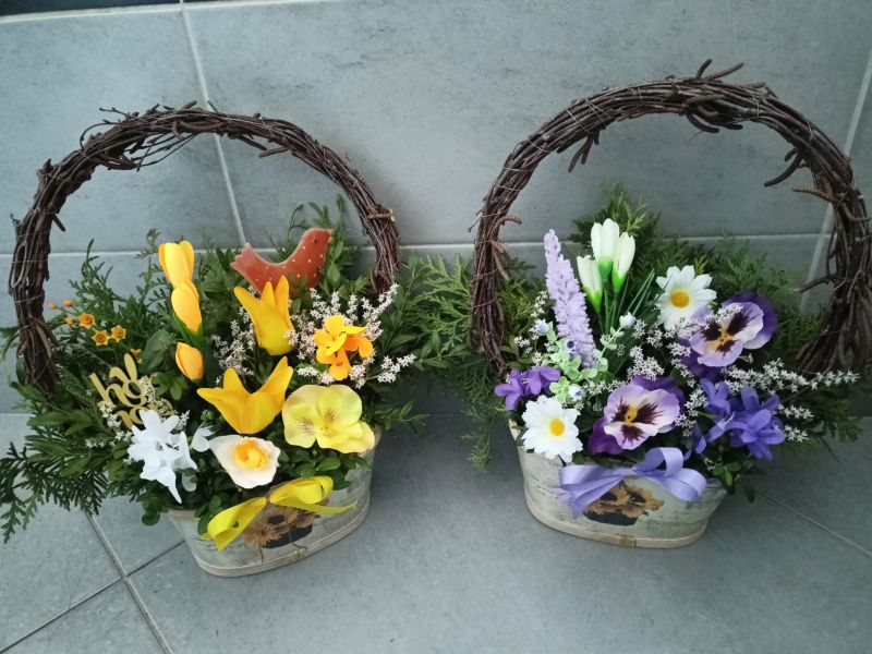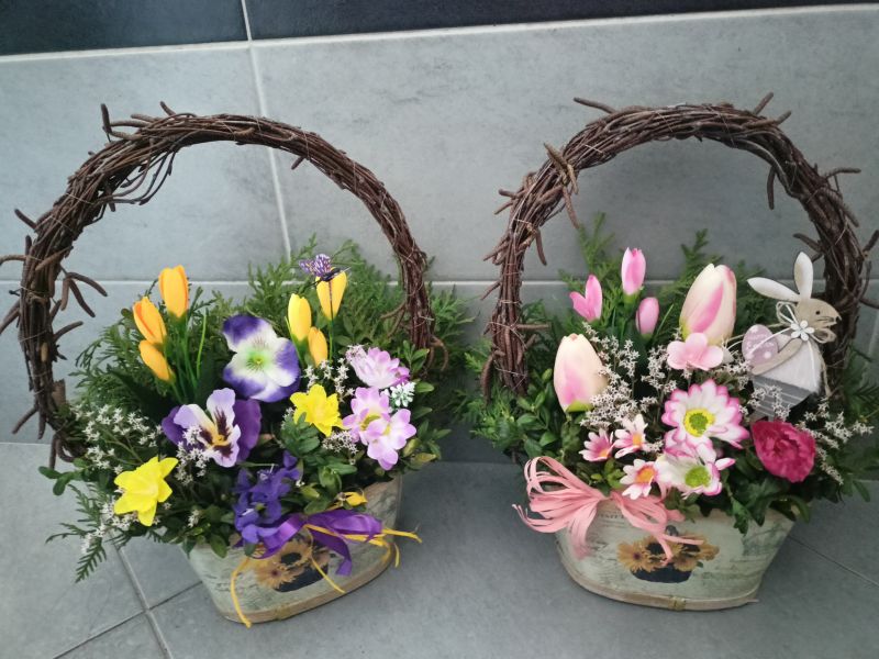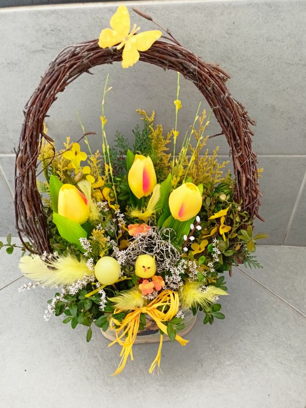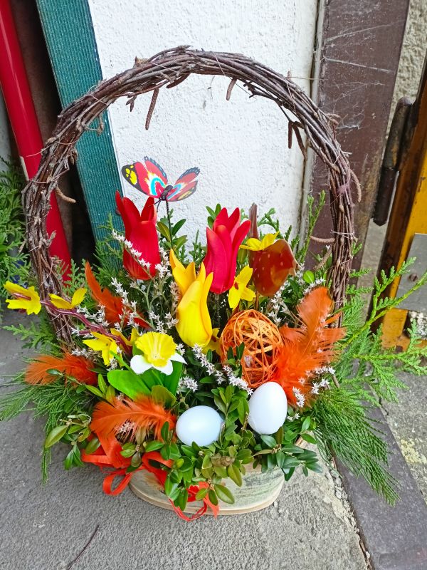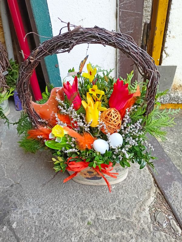 Velikonoční truhlík, vyplněný florexem, doplněný thujkami a buxusem,různá provedení dle dostupnosti materiálu.