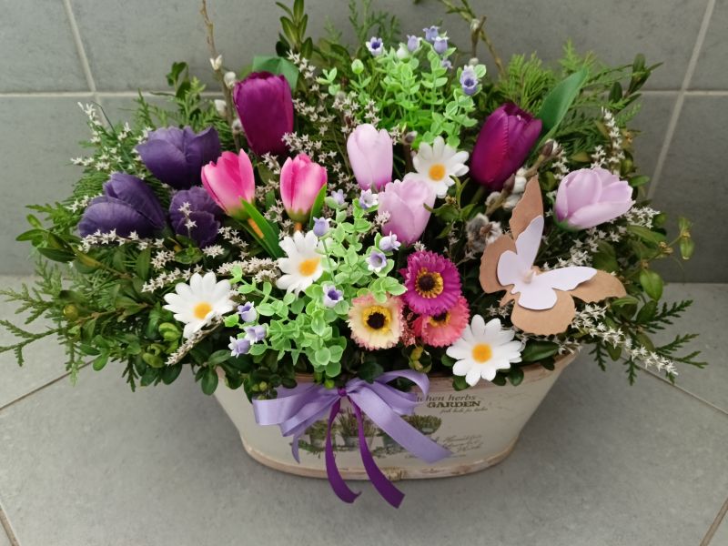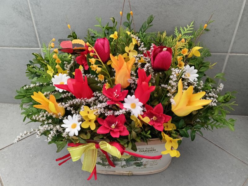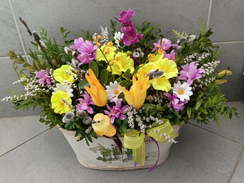 Velikonoční truhlík, vyplněný florexem, doplněný thujkami a buxusem,různá provedení dle dostupnosti materiálu.