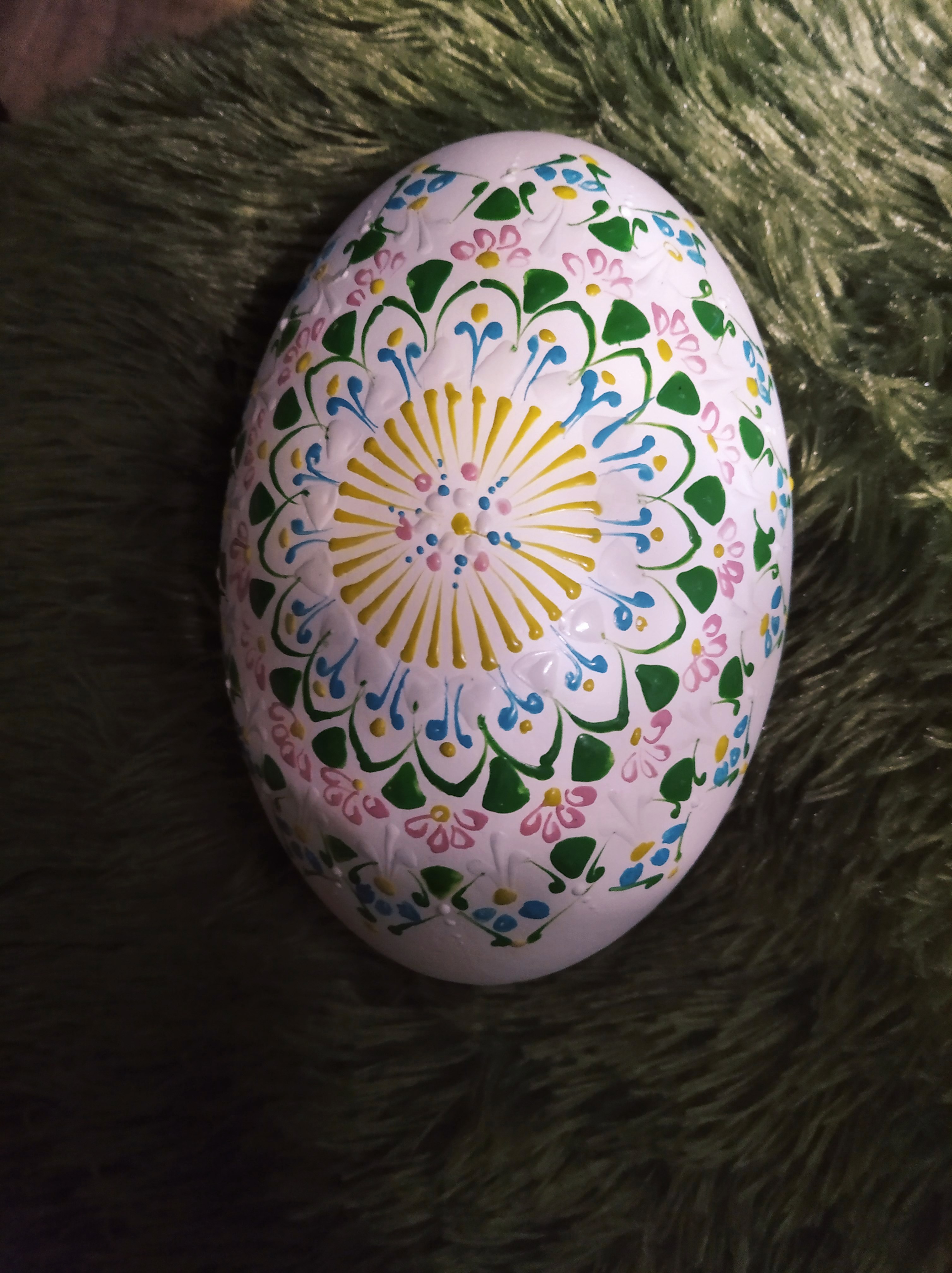 Velikonoční kraslice, vyfouknutá z pštrosího vejce (pštros Nandu), ponechaná přírodně bílá a ručně malovaná voskem.
