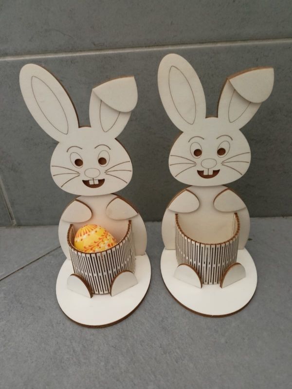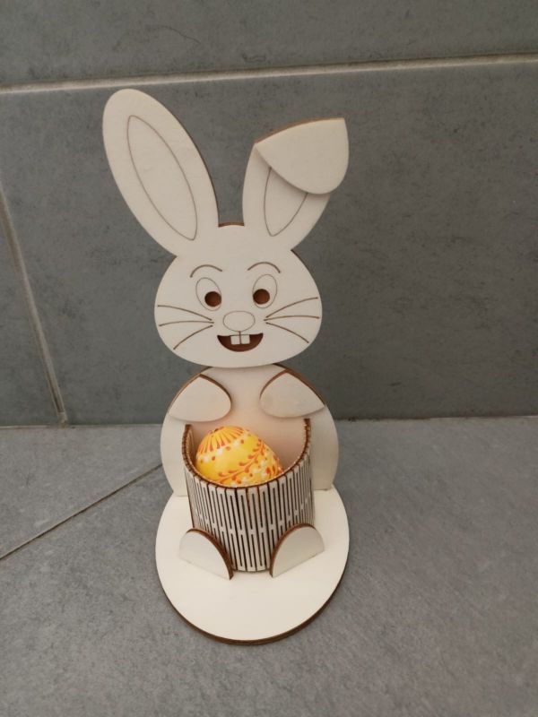 Zajíček s košíkem, stojánek na kraslici, čokoládové nebo Kinder vajíčko, z překližky. Super dárek pro koledníčky. Dodáváno bez kraslice, kraslici lze u nás doobjednat.