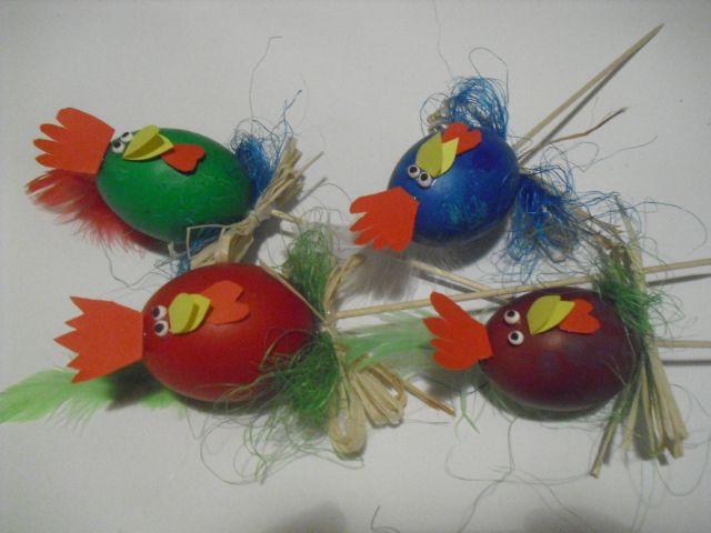 Velikonoční zápich, na špejli, vyrobený z vajíčka a stužek ze sisalu a lýka.