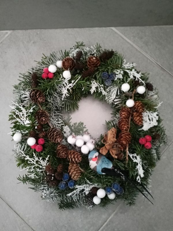 Zimní věnec z neopadavé jedličky Nobilis se ptáčkem